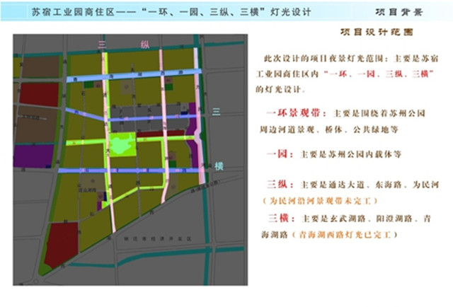 本次商住區(qū)亮化提升工程圍繞“一環(huán)、一園、三縱、三橫”進行重點打造,燈光設計以“綠色的、生態(tài)的”為定位,不但要展示宿遷的城市特質,提升市民的自豪感和安全感,鼓勵周邊市民夜間步行,還將以現(xiàn)代科技之光區(qū)展現(xiàn)蘇宿園區(qū)騰飛的城市變遷。