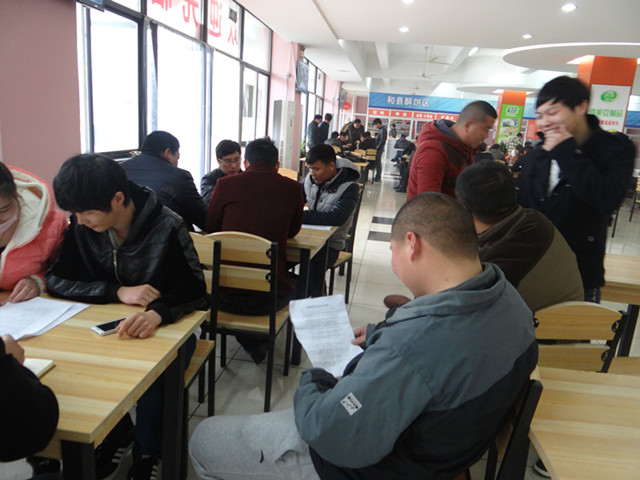 食堂的餐桌上被各種材料所覆蓋,盡管食堂中的噪音不小,有廚房炒菜的聲音,也有員工就餐時(shí)聊天的聲音,可是絲毫影響不了備考員工的熱情。一些員工一邊吃飯一邊看書(shū),還有的正在念念有詞地背書(shū)。