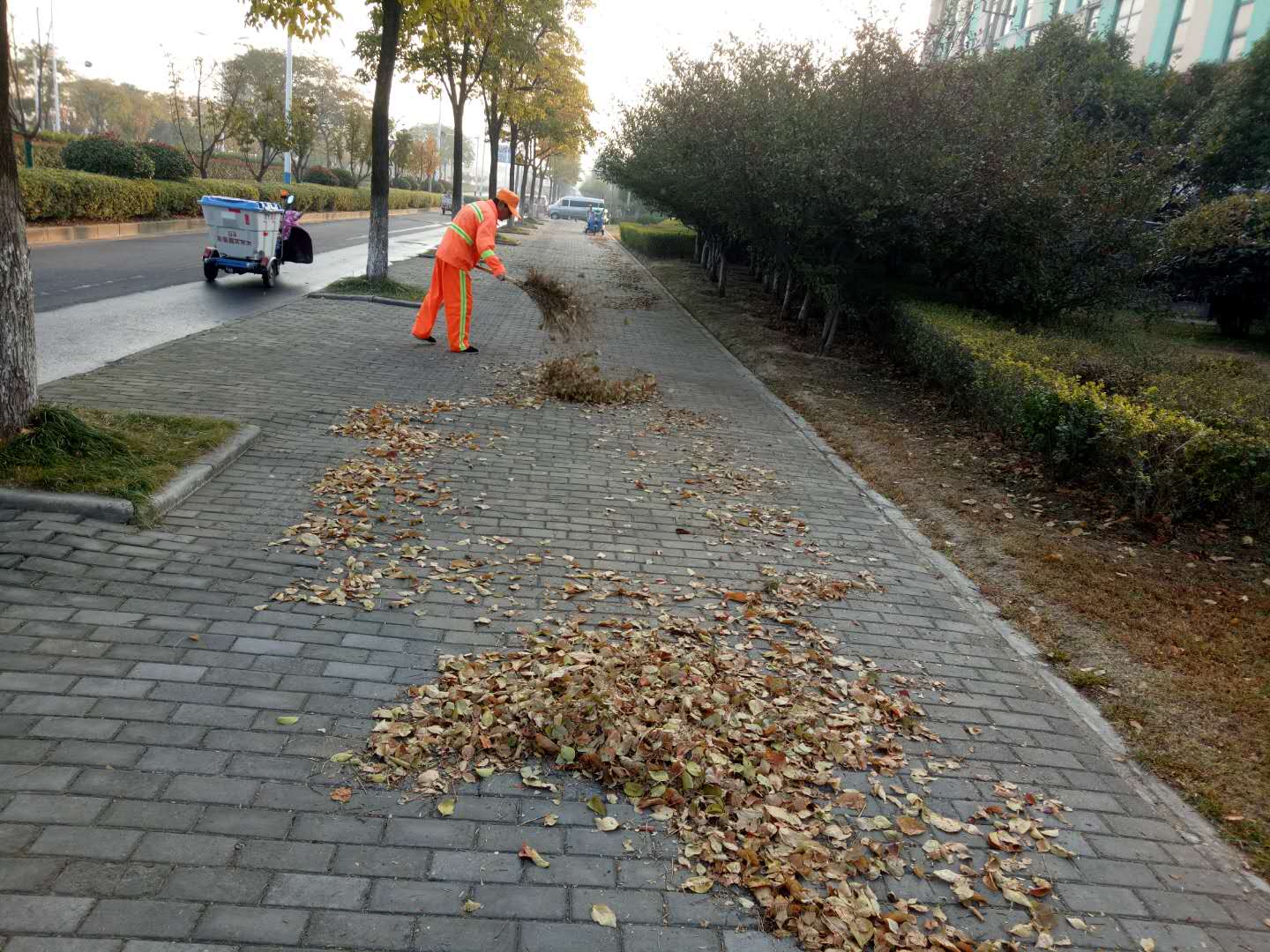 隨著氣溫下降,道路兩側(cè)的景觀樹植開始大面積落葉,環(huán)衛(wèi)工人再次迎來一年一度落葉清掃“攻堅戰(zhàn)”,為了及時清掃落葉,減少落葉堆積,公司迅速啟動清掃預(yù)案,加大對園區(qū)道路落葉清掃保潔力度。