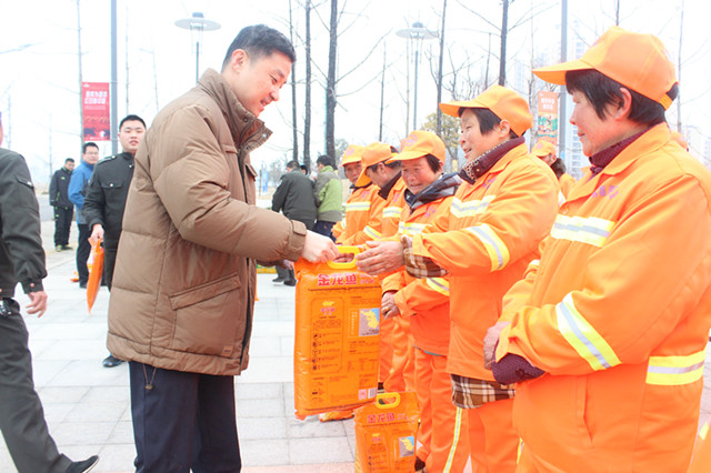 在慰問現(xiàn)場,許紹杰與城市維護(hù)工人親切握手,詢問他們工作、生活情況,并送上了米、油、面等慰問品,感謝他們一直以來為蘇宿園區(qū)城市維護(hù)工作付出的辛勤勞動,并衷心祝愿他們春節(jié)快樂、身體健康。