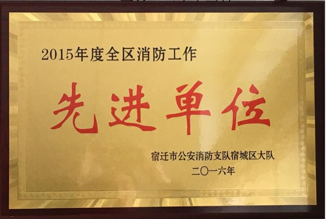 公司在2015年度全區(qū)消防安全工作評(píng)定中,喜獲“2015年度全區(qū)消防工作先進(jìn)單位”榮譽(yù)稱號(hào),此次消防安全工作由宿遷市消防支隊(duì)宿城區(qū)大隊(duì)評(píng)定。